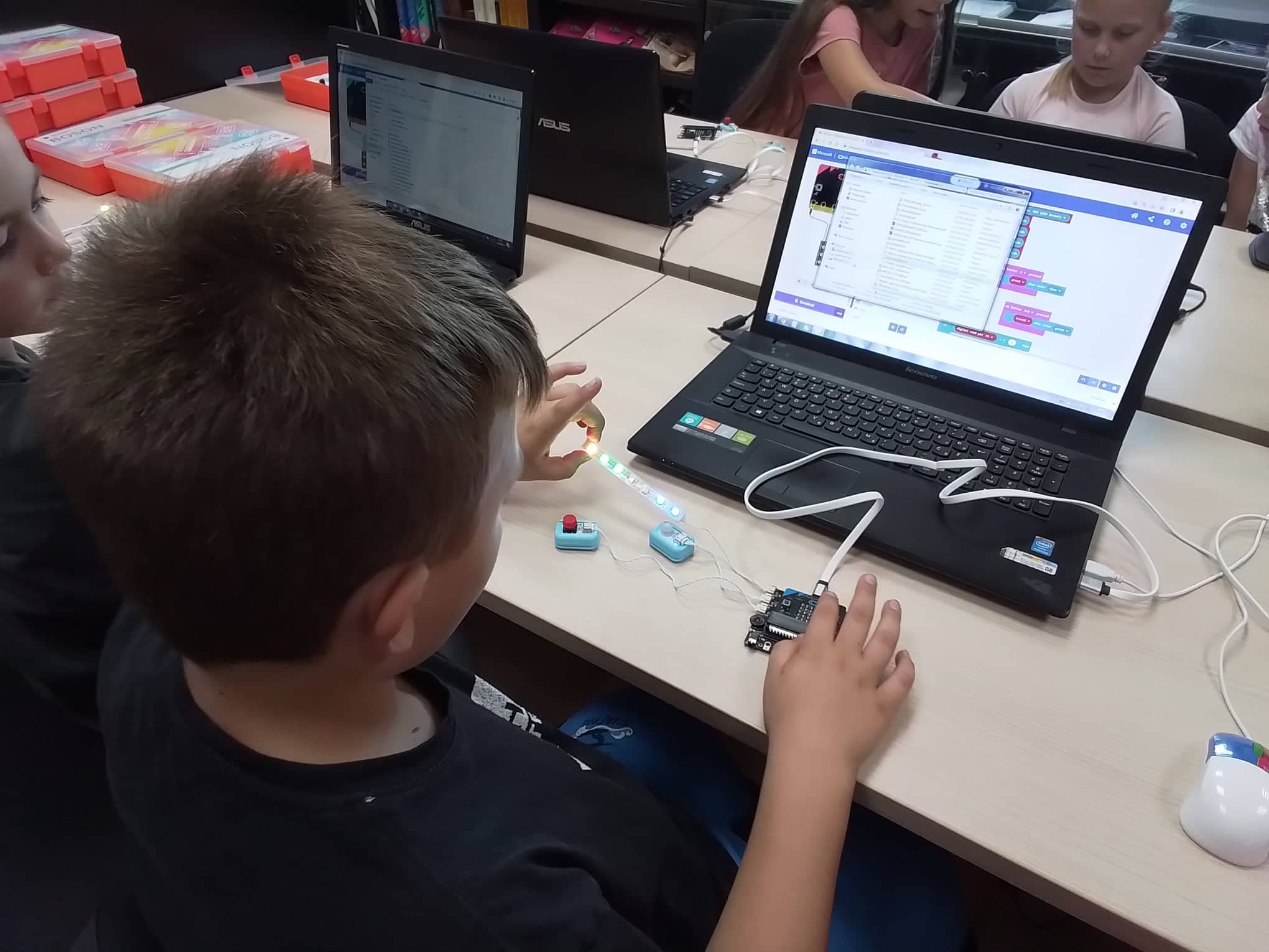 Mali programeri danas su bili jako vrijedni i isprogramirali svjetleće diode na traci. Kako smo radili s Boson setom, dodacima za micro:bitove, htjeli smo iskoristiti što više dodataka te smo grupirali po dvije ledice koje smo palili preko tipkala na micro:bitu, a zadnju pomoću senzora pokreta. Programiranje je potrajalo, no ishod je oduševio naše male polaznike. Svi su bili zadovoljni kad su vidjeli što su uspjeli isprogramirati. Većina se prvi put susrela s programiranjem i micro:bitovima, a nadamo se da smo probudili želju za dodatnim znanjem iz ovog područja.