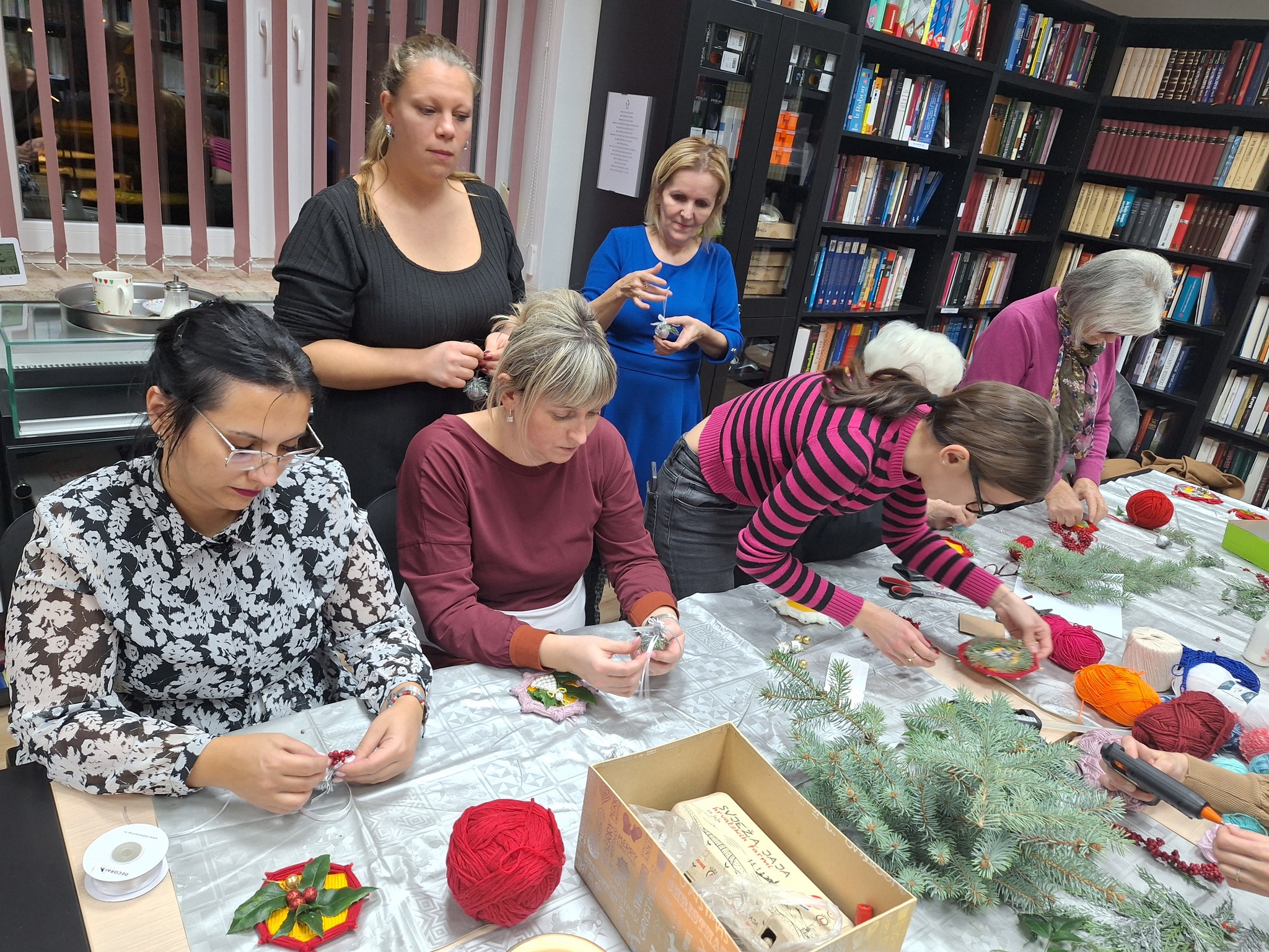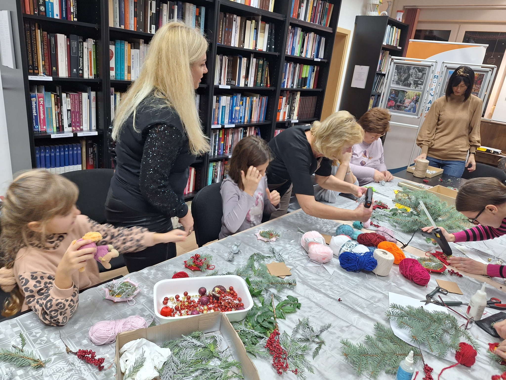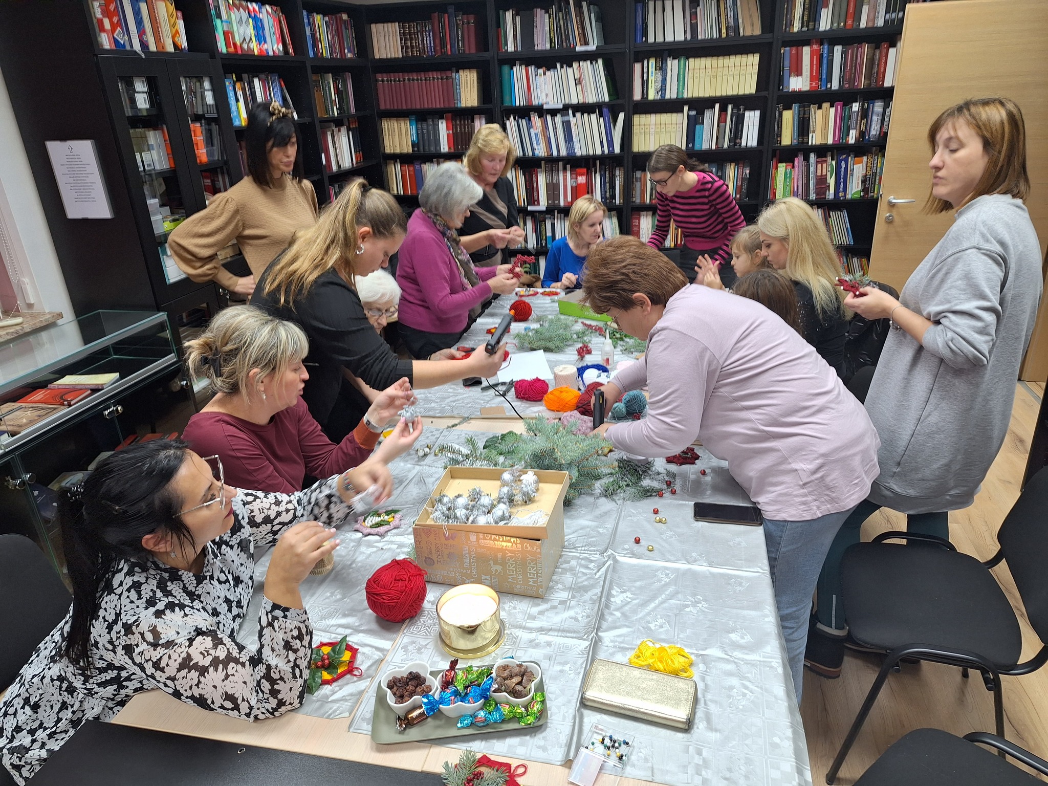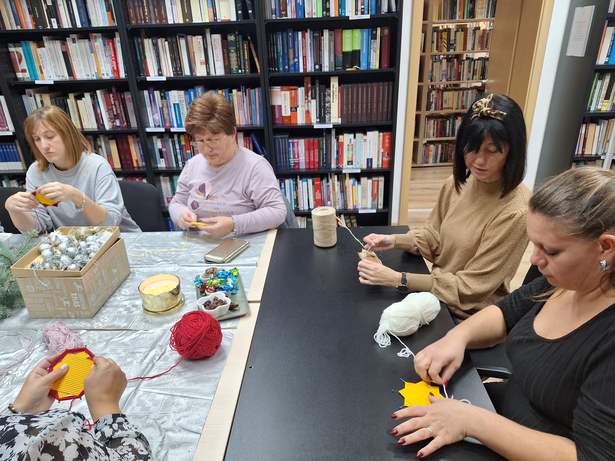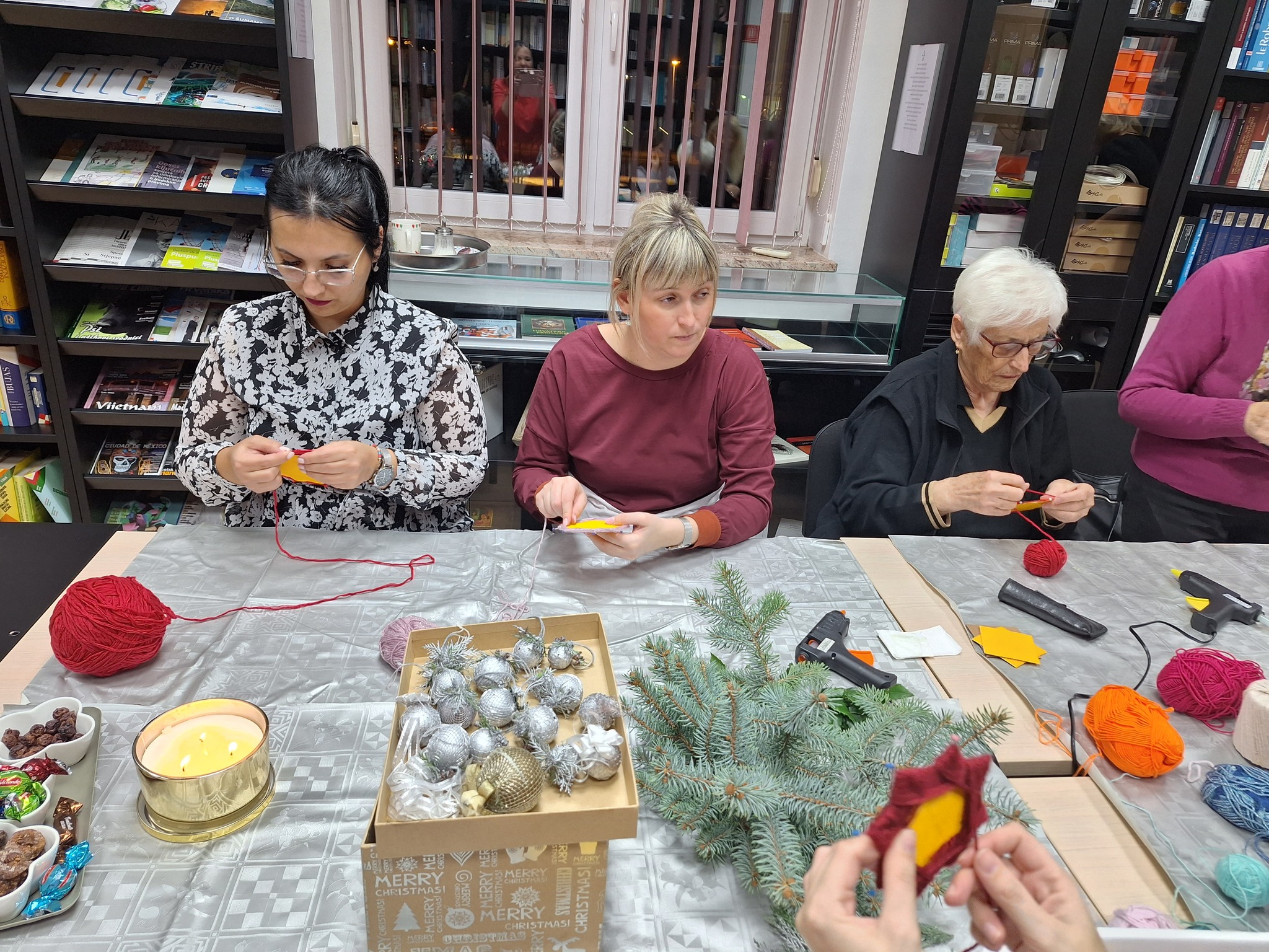 U ponedjeljak, 2. prosinca, naša je Čitaonica doista bila dnevnim boravkom zajednice zahvaljujući gospođi Mariji Anđelić koja je vodila radionicu izrade božićnih ukrasa. Polaznicama je pokazala dva modela: jedan od kartona i vune, a drugi od plodova iz prirode. Polaznice su ove jednostavne podloge ukrasile grančicama, trakicama i perlicama te tako kreirale predivne ukrase.