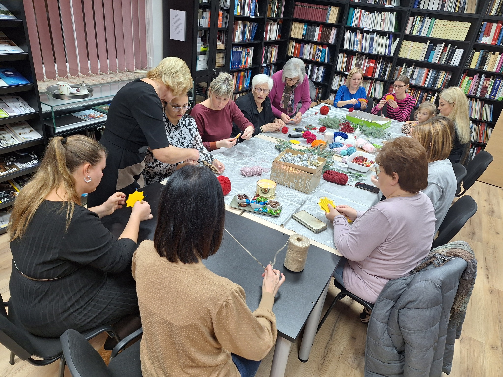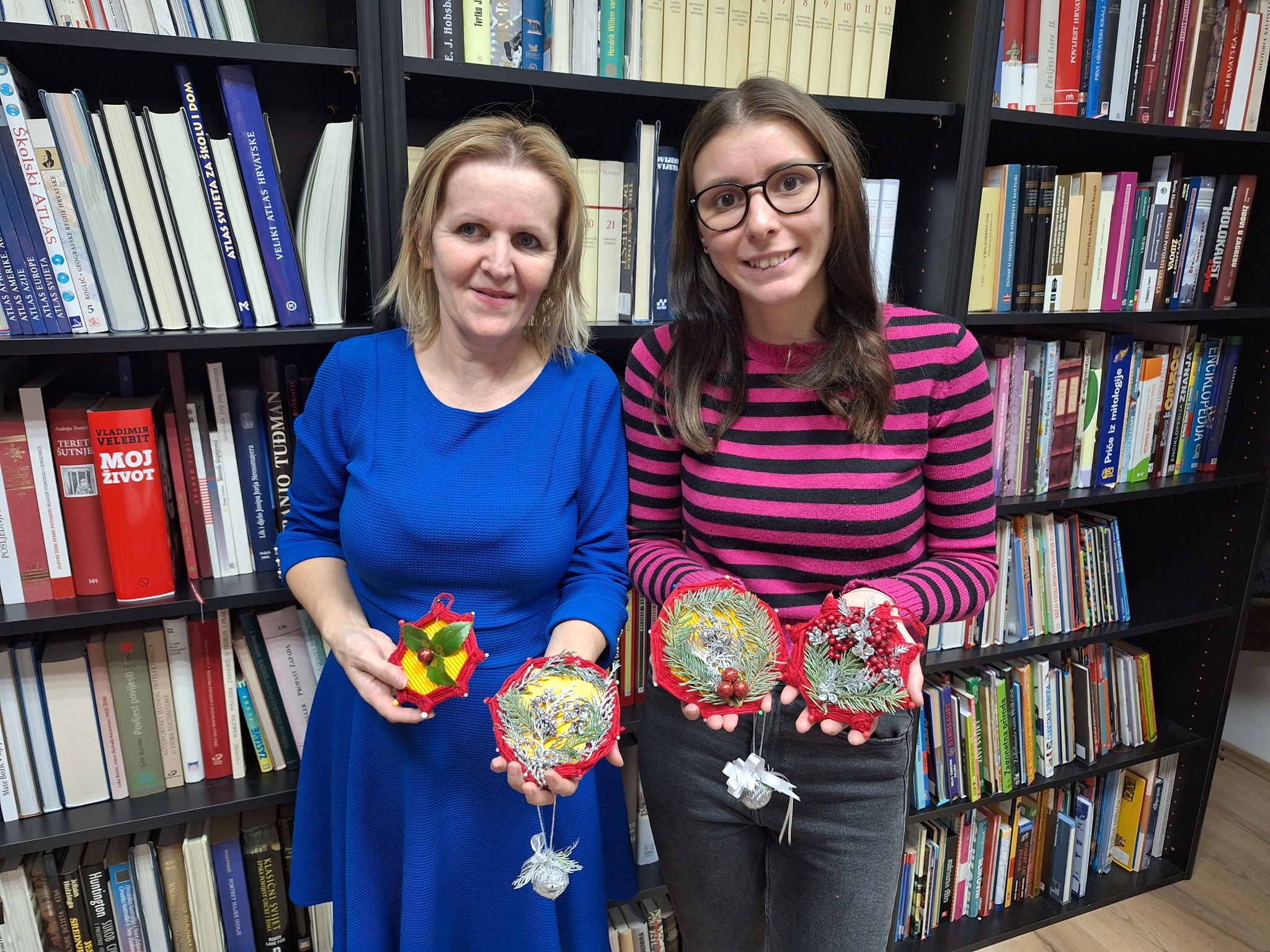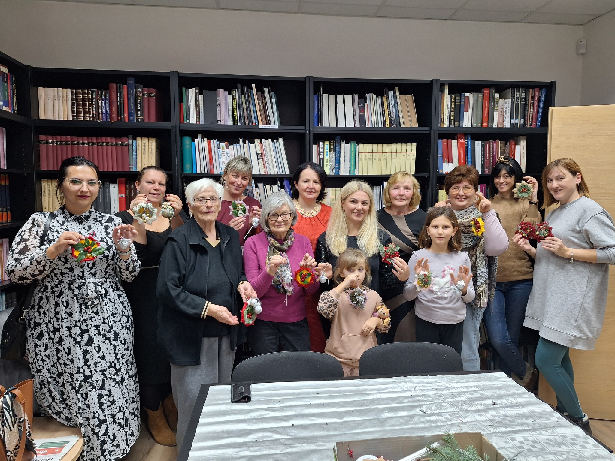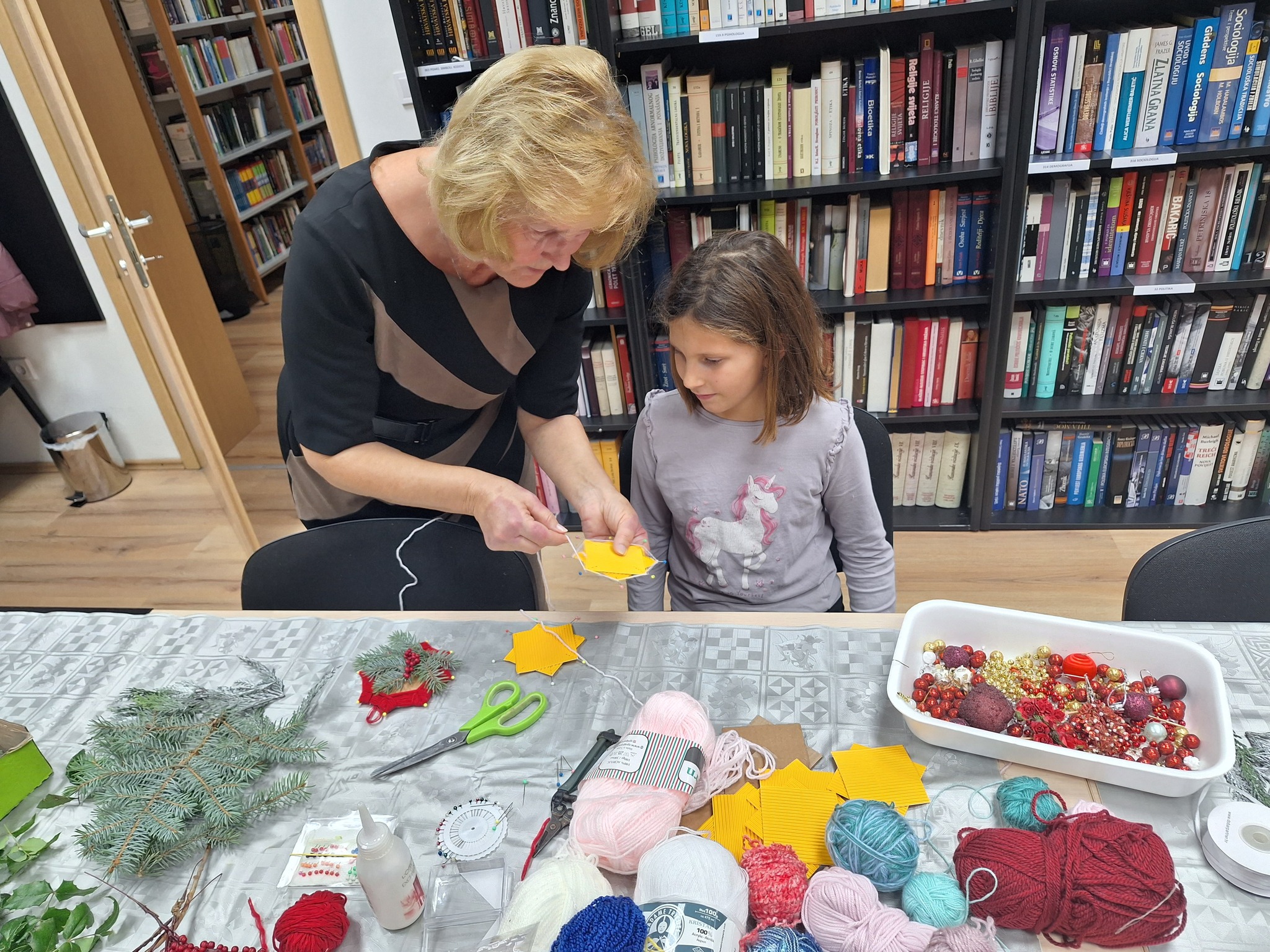 U ponedjeljak, 2. prosinca, naša je Čitaonica doista bila dnevnim boravkom zajednice zahvaljujući gospođi Mariji Anđelić koja je vodila radionicu izrade božićnih ukrasa. Polaznicama je pokazala dva modela: jedan od kartona i vune, a drugi od plodova iz prirode. Polaznice su ove jednostavne podloge ukrasile grančicama, trakicama i perlicama te tako kreirale predivne ukrase.