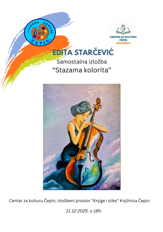 U suradnji s Likovnom udrugom Čepin, toplo vas pozivamo na svečano otvorenje samostalne izložbe “Stazama kolorita” Edite Starčević. Otvorenje izložbe održat će se u četvrtak, 11. prosinca, u 18:00 sati. Izložba će biti postavljena u izložbenom prostoru “Knjige & Slike” Knjižnice Centra za kulturu Čepin.